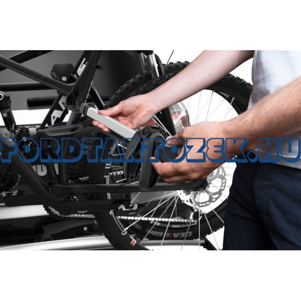 - A Thule VeloSpace kerékpártartókon kereküknél a biciklik egy-egy tartópapucsba állítva gyorsrögzítő pántokkal és a vázuknál megfogva rögzíthetőek.