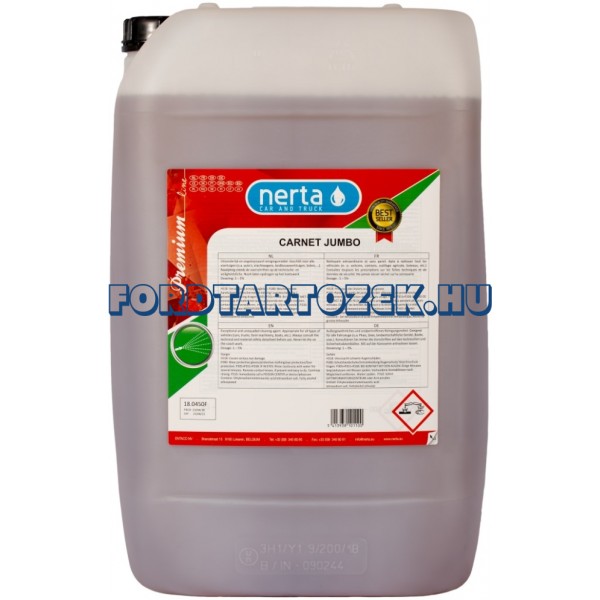 A Nerta Carnet Jumbo egy gyengén alkáli, erősen koncentrált, különleges, összeállítású, személy és tehergépjárművek tisztításához ajánlott termék. A Nerta Carnet Jumbo probléma nélkül tisztítja az úgynevezett sztatikus szennyeződést. A Nerta Carnet Jumbo könnyen eltávolítható és nem hagy fehér foltot. Az összetételének köszönhetően a karosszéria víztaszító és csillogó lesz. A Nerta Carnet Jumbo többféleképpen is felhasználható, de különlegesen erős áztató hatása miatt, porlasztással felhordva, előmosószerként ajánlott. Felhasználható gépi autómosókban, magasnyomású habosító vagy porlasztó készülékkel és a hagyományos kézi tisztítással is.